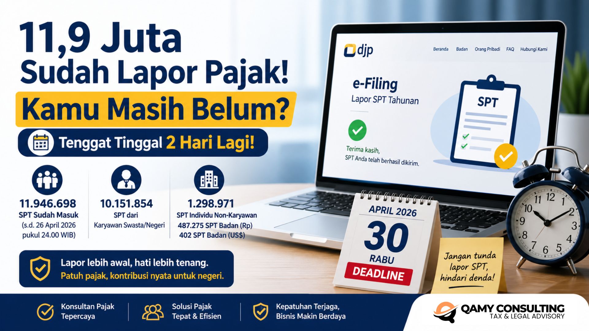 Direktorat Jenderal Pajak (DJP) mengumumkan angka mencengangkan: hampir 12 juta wajib pajak sudah menyerahkan Surat Pemberitahuan (SPT) Tahunan untuk Tahun Pajak 2025 per Minggu malam, 26 April 2026, pukul 24.00 WIB. Ini baru empat hari menjelang deadline 30 April 2026 untuk wajib pajak pribadi maupun badan.